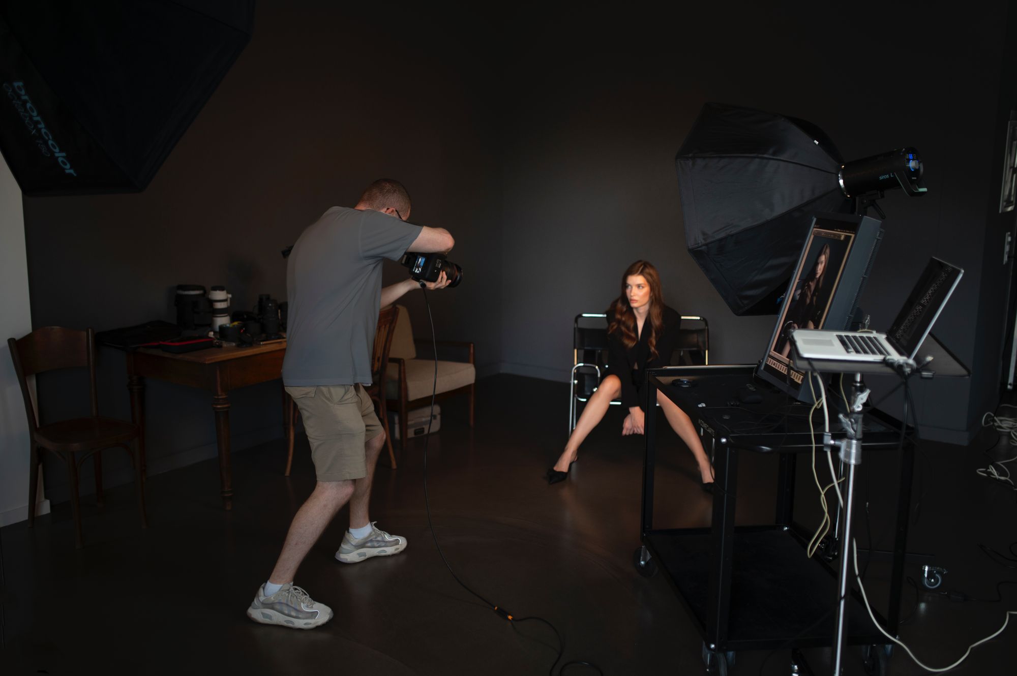 Our first area features textured grey walls and dark flooring, creating a moody industrial atmosphere perfect for fashion photography, commercial shoots, and striking portrait work. The professional lighting setup and tethered shooting capabilities ensure complete creative control for demanding projects.