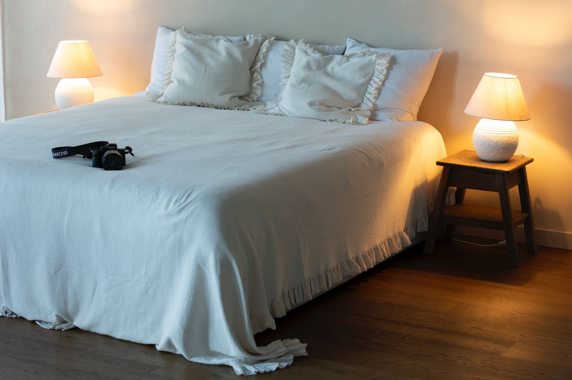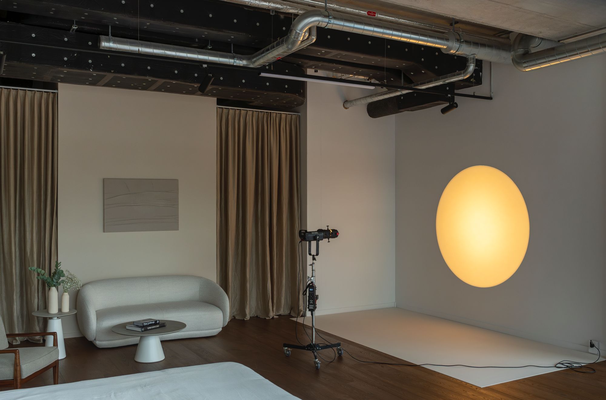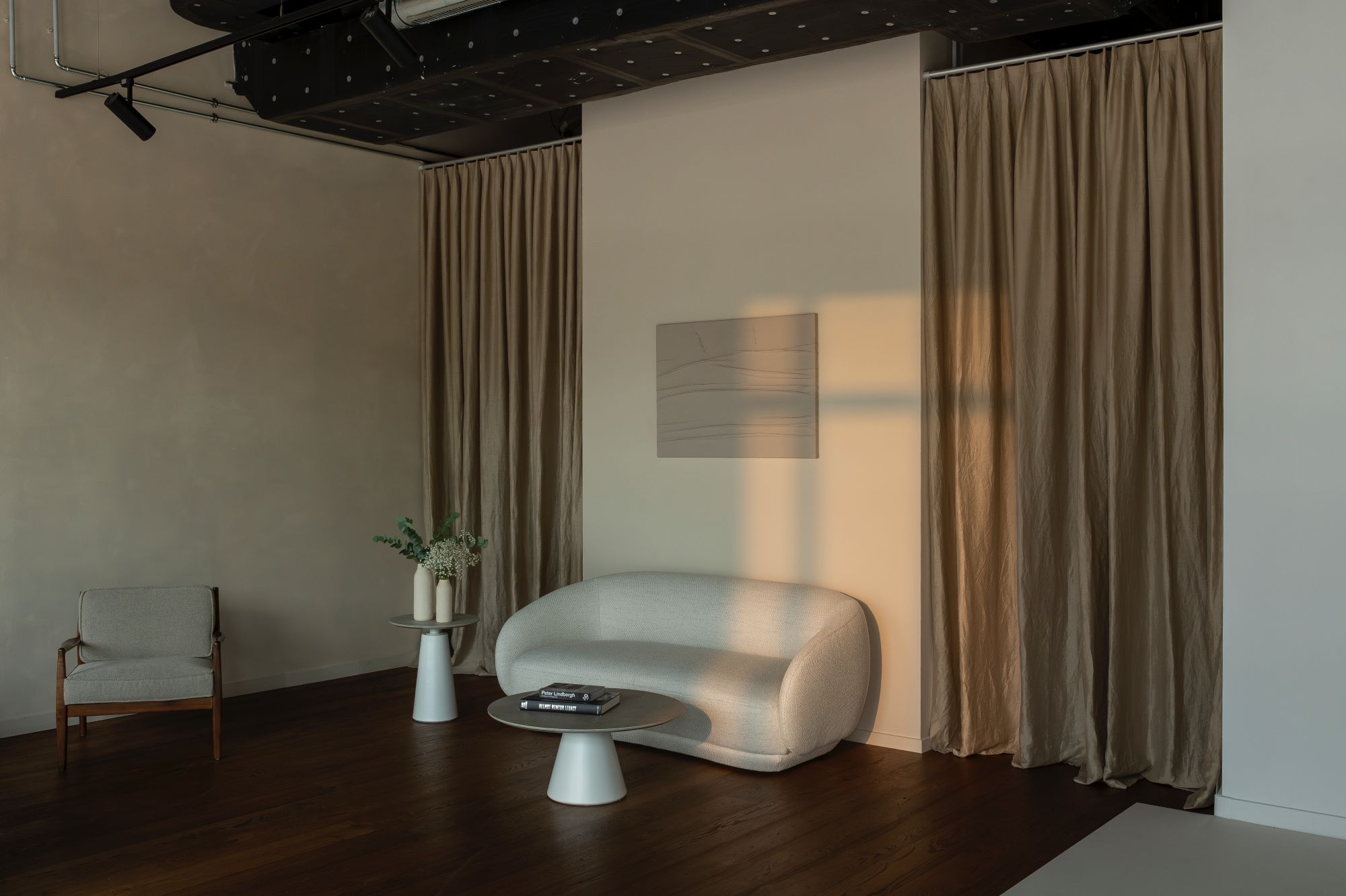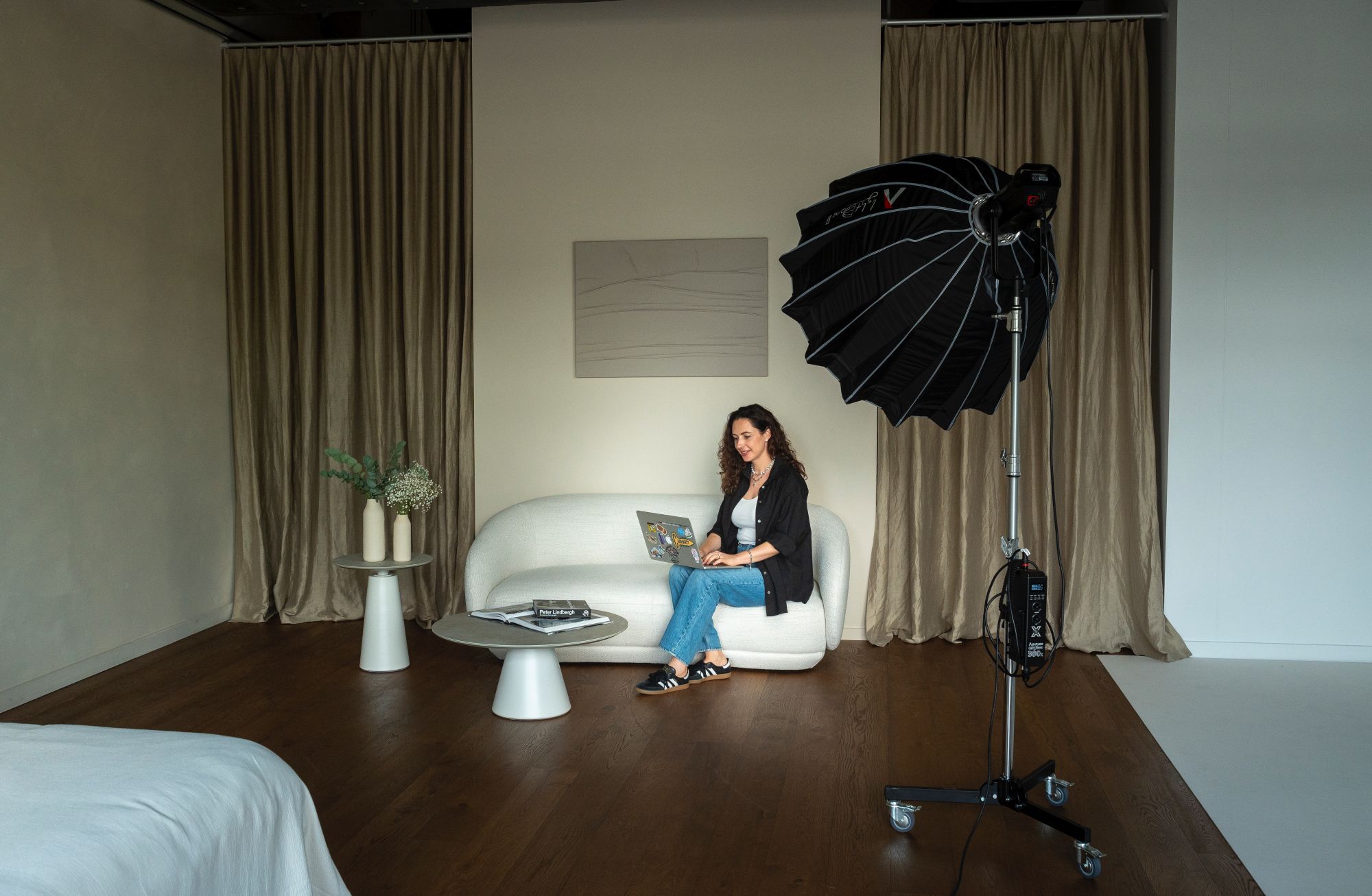 The second area offers a completely different aesthetic with rich wooden floors, elegant linen curtains, and carefully curated modern furniture. This light-filled environment provides the ideal backdrop for lifestyle photography, beauty shoots, and intimate portrait sessions where natural warmth and sophistication are essential.